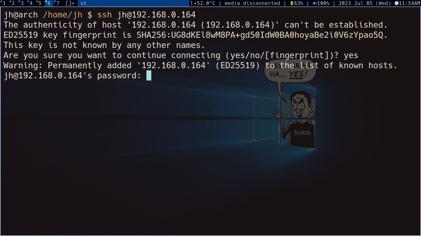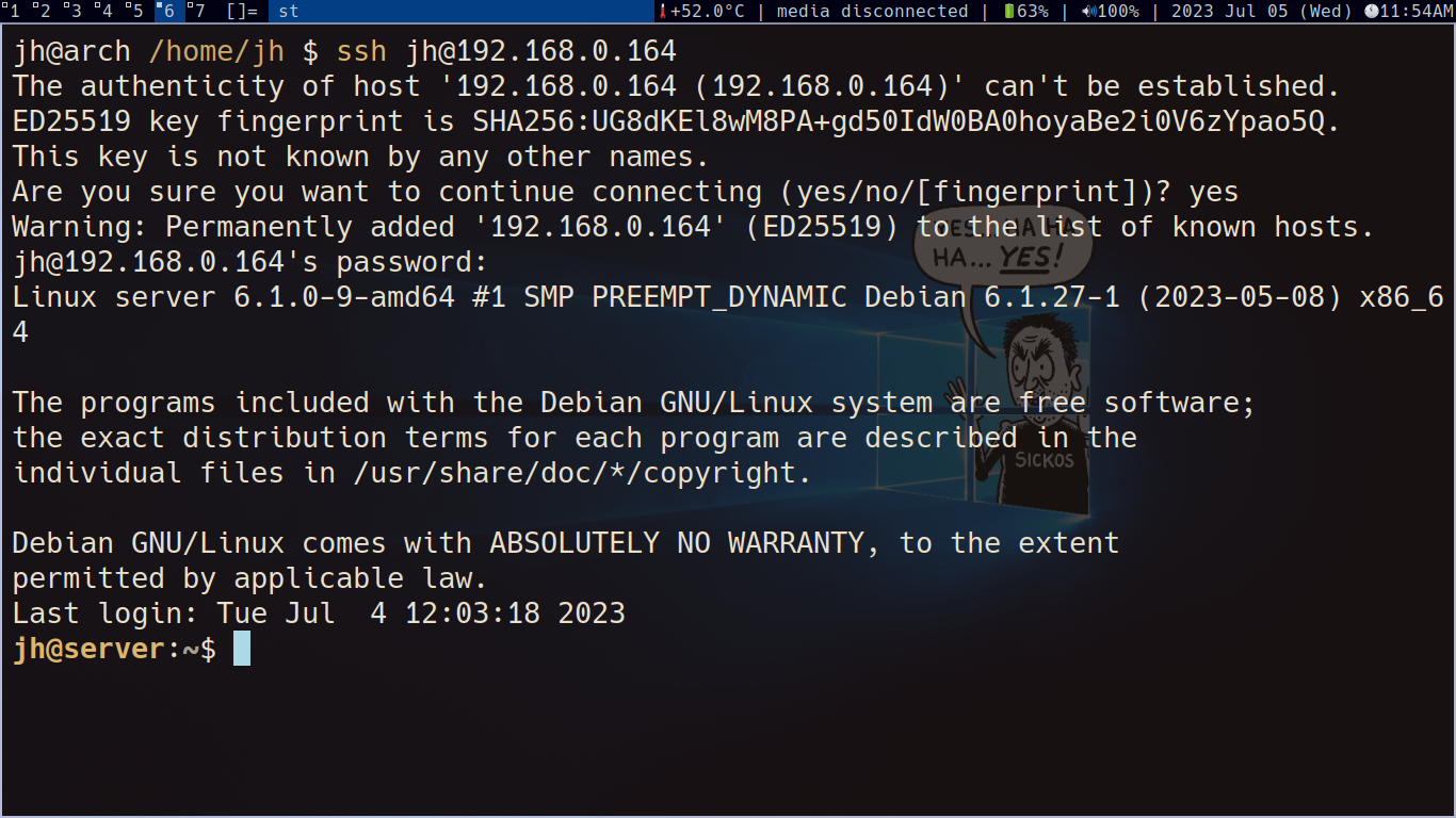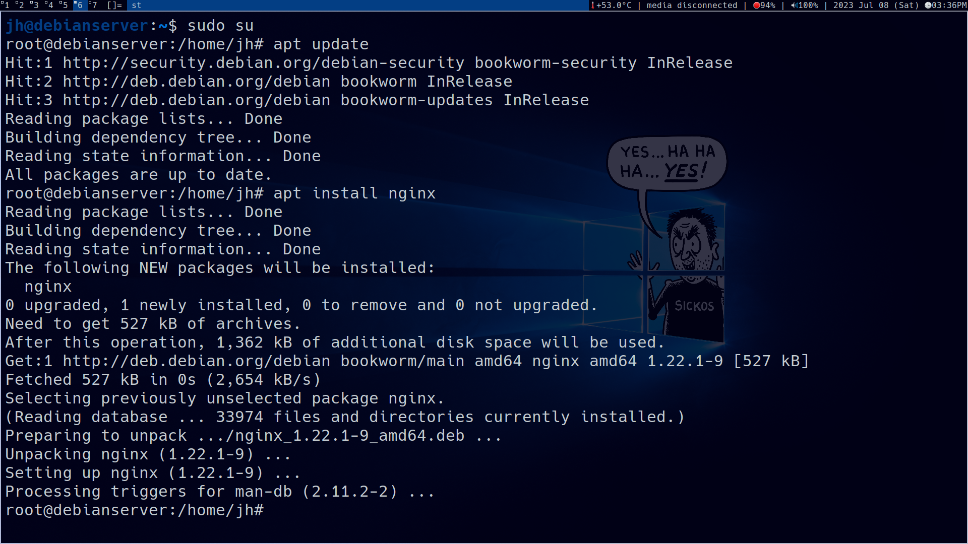 Last login: Wed Jul 5 15:54:03 CEST 2023 from 192.168.0.104 on pts/0 jh@server:"$ sudo apt update [sudo] password for jh: