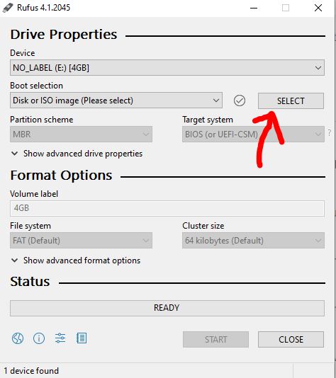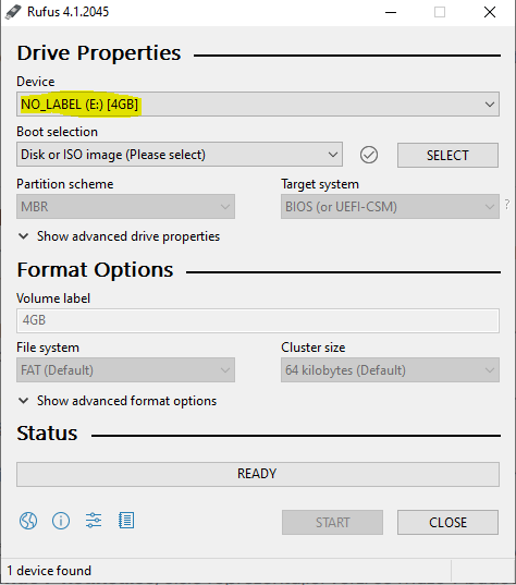 Otevřete aplikaci Rufus a zapojte Váš usb flash disk (!! o data na flash disku tímto procesem přijdete, proto prosím použijte disk prázdný, nebo s daty, která nepotřebujete!!)