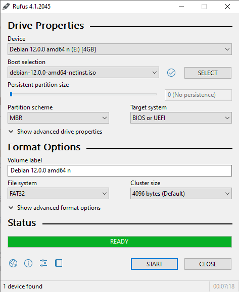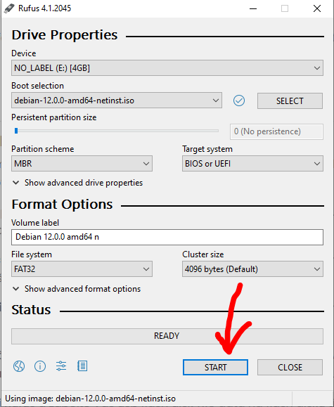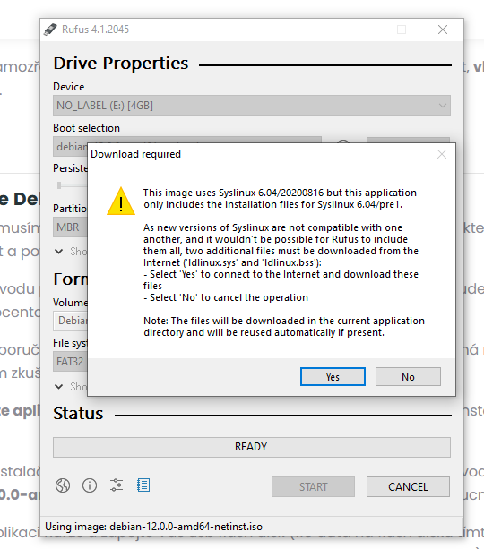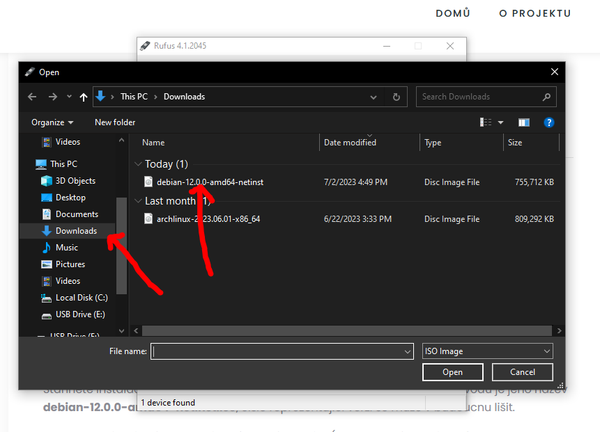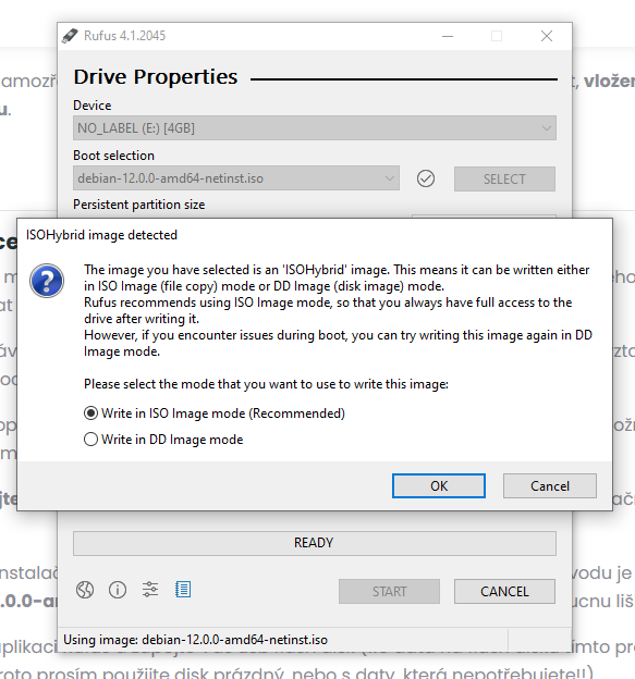 Stáhněte instalační soubor Debianu ze stránky zde. V době tvorby tohoto návodu je jeho název debian-12.0.0-amd64-netinst.iso, číslo reprezentující verzi se může v budoucnu lišit.
