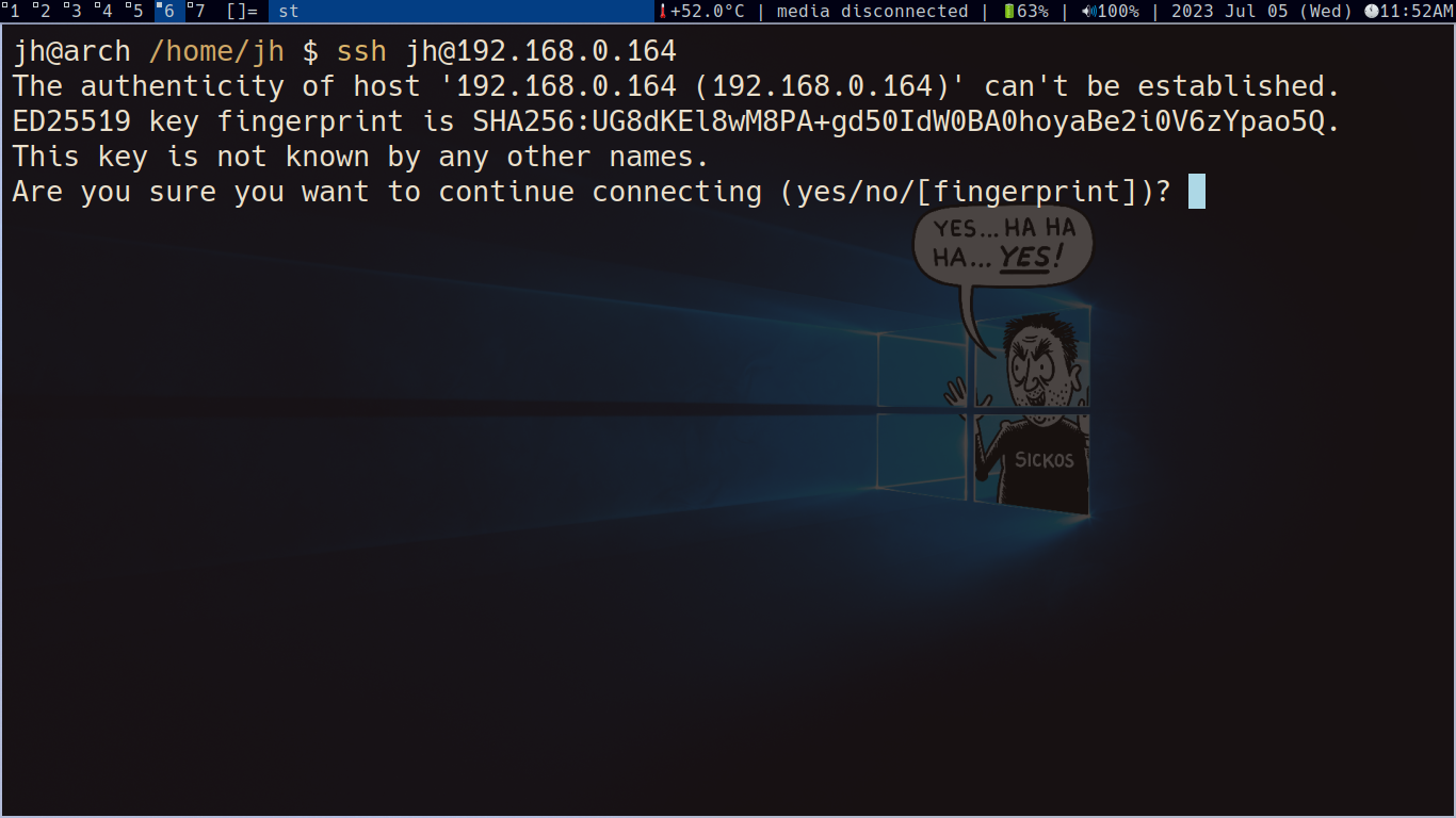 Po zadání příkazu budete muset potvrdit fingeprint (yes) a přihlásit se zadáním hesla pro uživatele na Debian serveru.